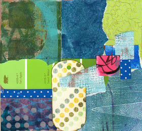 May 5-11: continuing with collage focus this week; inspired by Randel Plowman's style and book, The Collage Workbook, lesson 9: squares & rectangles. I decided to pull out my scrap bins (full of all those little pieces I can't quite throw away!) that I sort by warm, cool, and neutral colors. The couple of collages I made earlier in the week were from the neutral box; these are obviously from the color boxes!